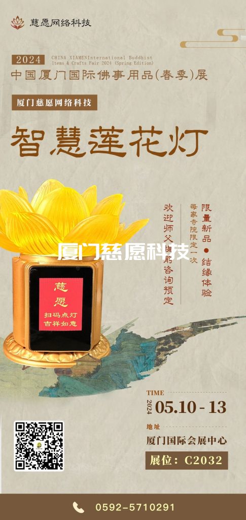 精耕多年,推陳出新,此次春季佛事展。慈愿帶來多款智能佛前蓮花燈以及祈福牌位等新品,在展位可掃碼體驗。