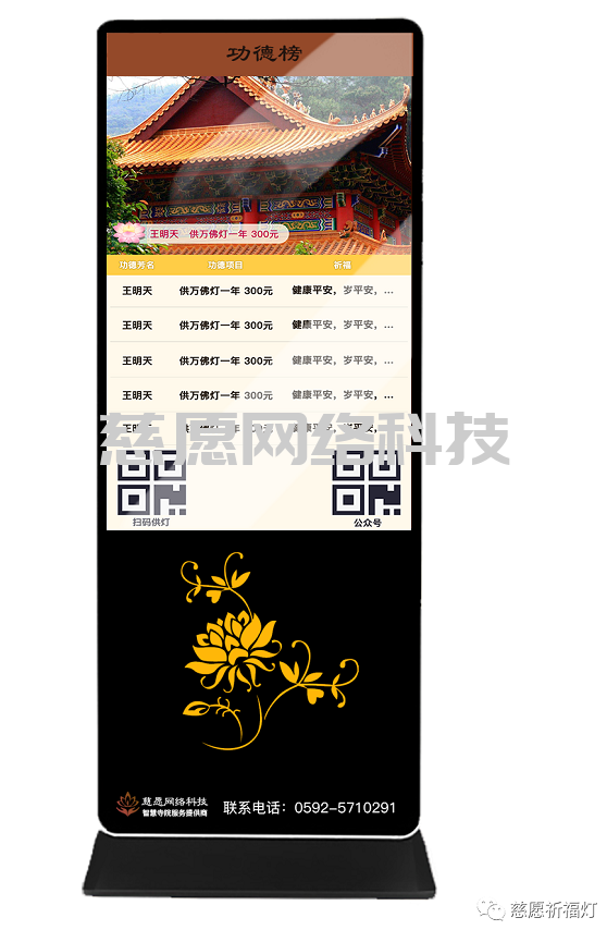 寺院捐贈系統中的供燈祈福模塊讓信眾通過微信公眾號、APP或觸摸屏、現場掃碼線上線下按天、按月、按年付費供燈,直播查看祈福信息。